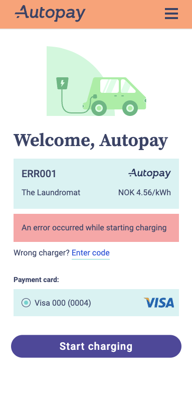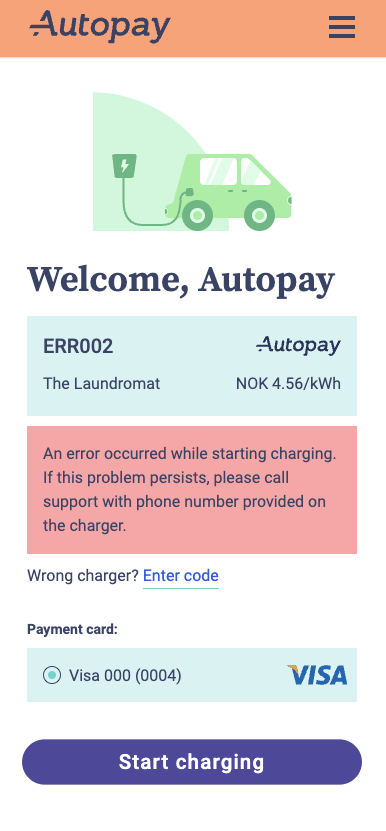 If you see an error message while attempting to start a charging session, please locate the support phone number on the charger.