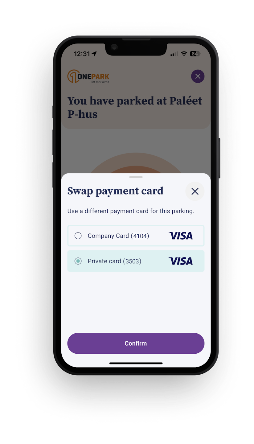 If you have added an additional payment card, such as a company card or similar, you can easily swap between payment cards while parked.